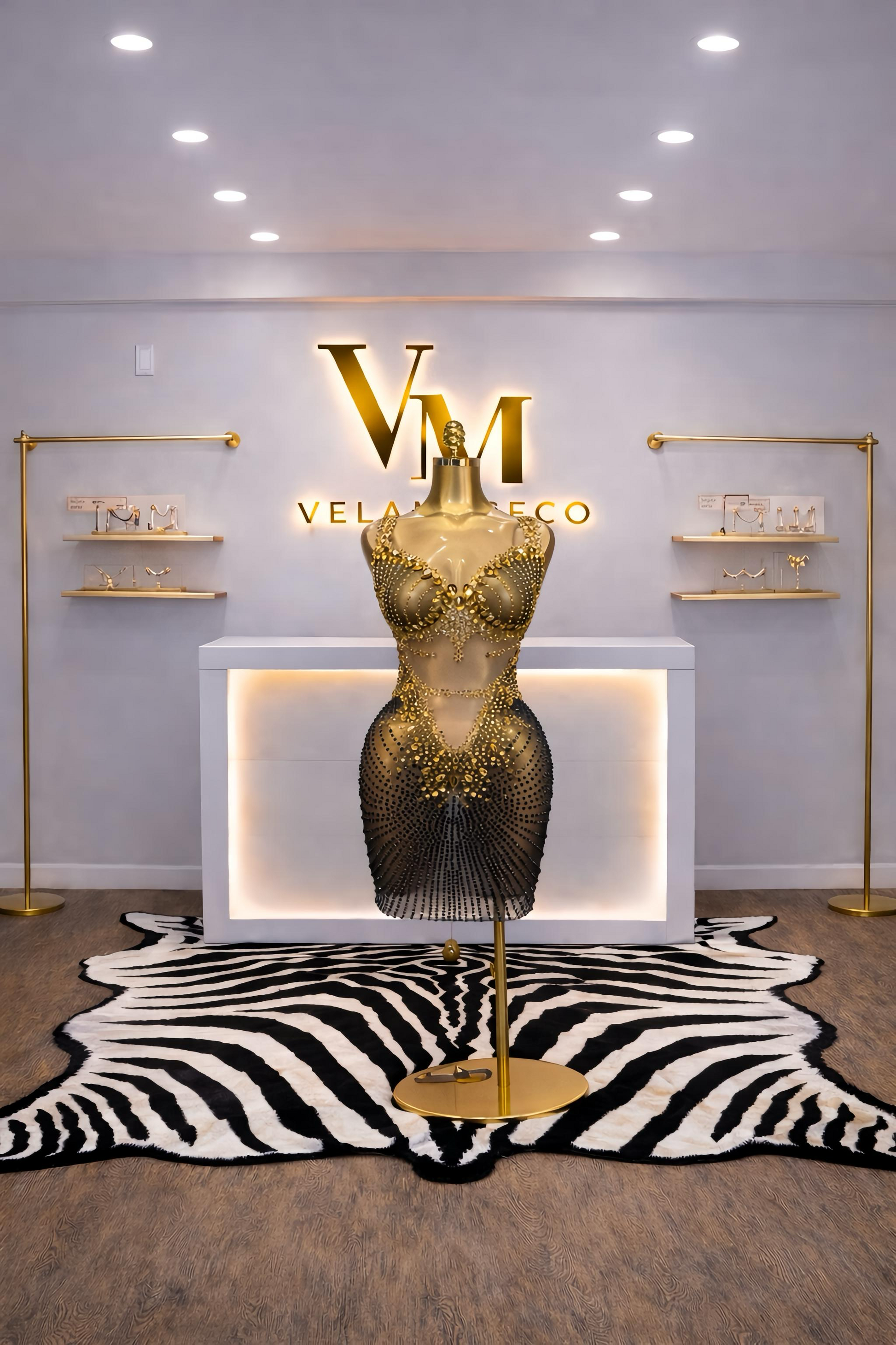 Sheer mesh mini dress adorned with gold crystal detailing for a sculpted, show-stopping silhouette.